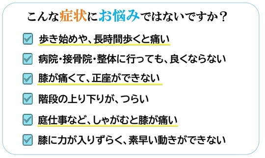 病院でも良くならない、薬が効かない、どこに行っても改善しない「つらい膝の痛み」は当院へご相談ください。